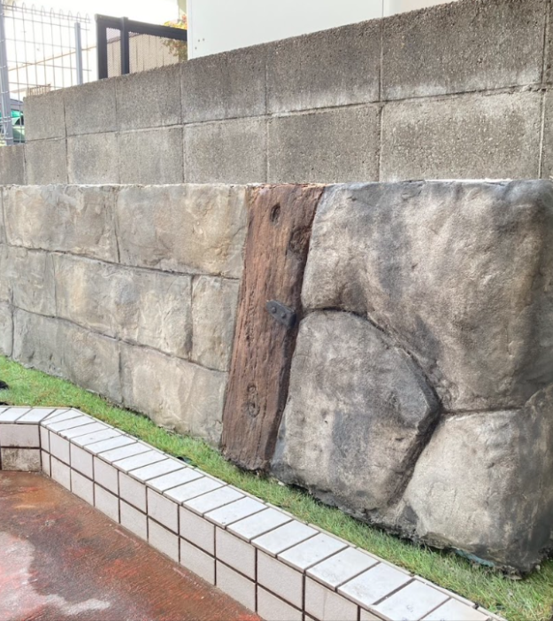外構では、無機質なブロック塀を岩肌や木材調に造形し、自然素材のような温かみある景観を演出。