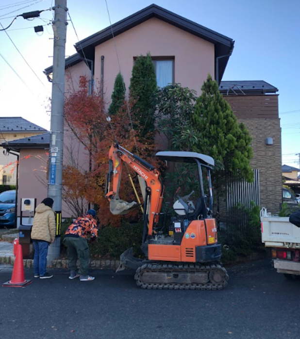 庭木の剪定・撤去から残土の鋤取りを行い、駐車スペースを確保。